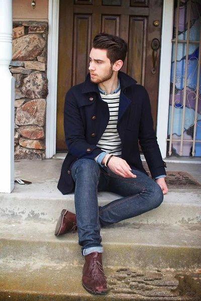 搭配技巧:蓝色风衣条纹毛衣牛仔裤布洛克鞋 8觉得穿西装太正式?那件商务风衣是你不错的选择。不要欺负总裁feel,绅士一秒。