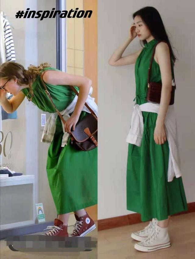 穿绿色连衣裙:这件绝对是今年最受欢迎的颜色之一!上身超有气质的白色,低饱和度的绿色充满高级感。这种面料不是特别软塌塌的,但是很时尚却不会太热。非常适合夏天穿。虽然是腰带型,但是一点都不胖。版型对身材很包容,对腰腹很友好,搭配裸色平底凉鞋很舒服很舒服。 Look3绿色连衣裙高帮帆布鞋