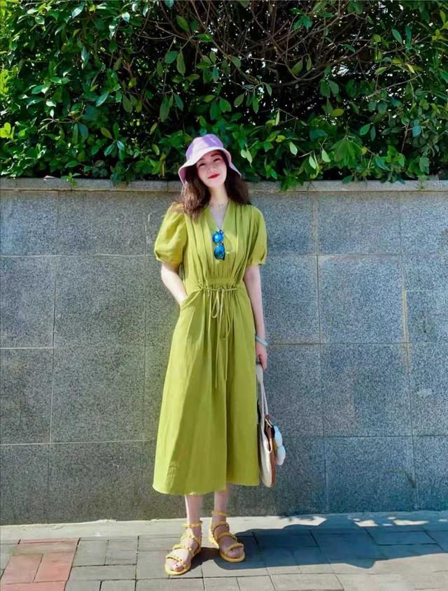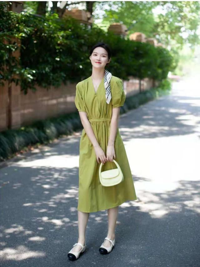 穿绿色裙子:我太喜欢这条裙子了,大概是会走路的鳄梨吧。这个绿色只是白了一度,也很吸引人。配色是黄色手包,丝巾会更法式。我脚上穿的是色彩搭配强烈的玛丽珍芭蕾舞鞋。 Look5芥末绿色棉麻连衣裙,搭配同色系果冻凉鞋