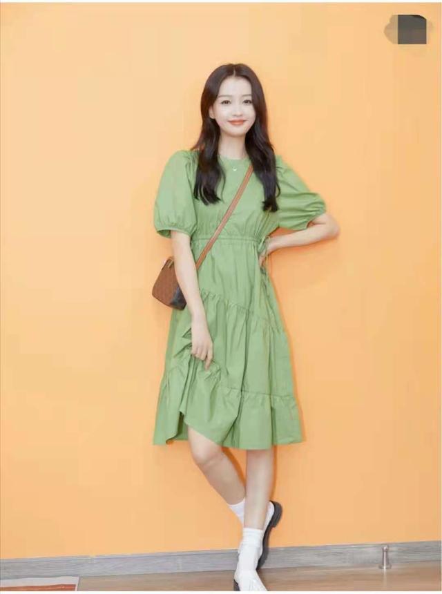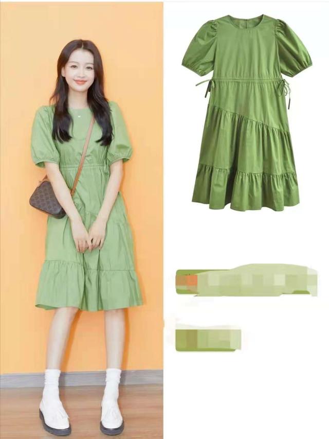 穿绿色连衣裙:孙的美腿真的很惊艳。这件绿色的泡泡袖法式连衣裙有一种夏天的感觉。搭配白色皮鞋,休闲又甜美,长相甜美,身材完美。太棒了。 Look8浅蓝色连衣裙白色金属扣鞋