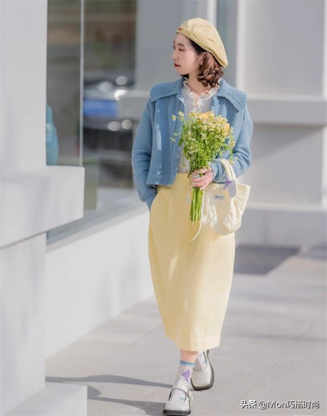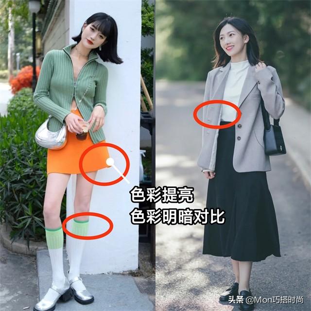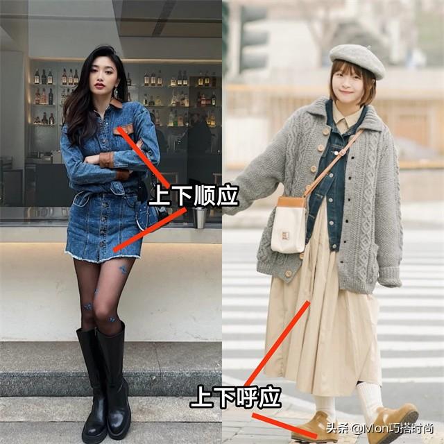当外套或鞋子颜色暗淡时,可以用亮色或亮色来提亮裙子。 外套、鞋子和裙子之间也可以形成颜色的对比。悄悄告诉你,外套上鲜艳的颜色会显得更高~ (三)色彩呼应/顺应规律