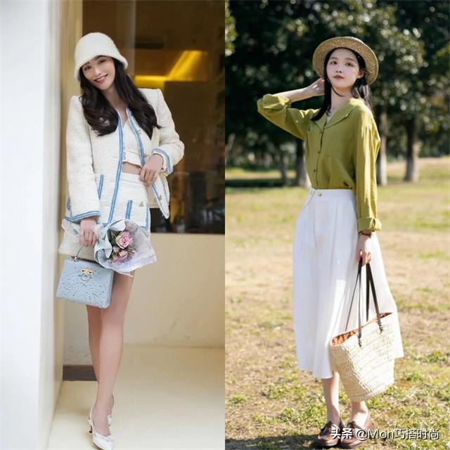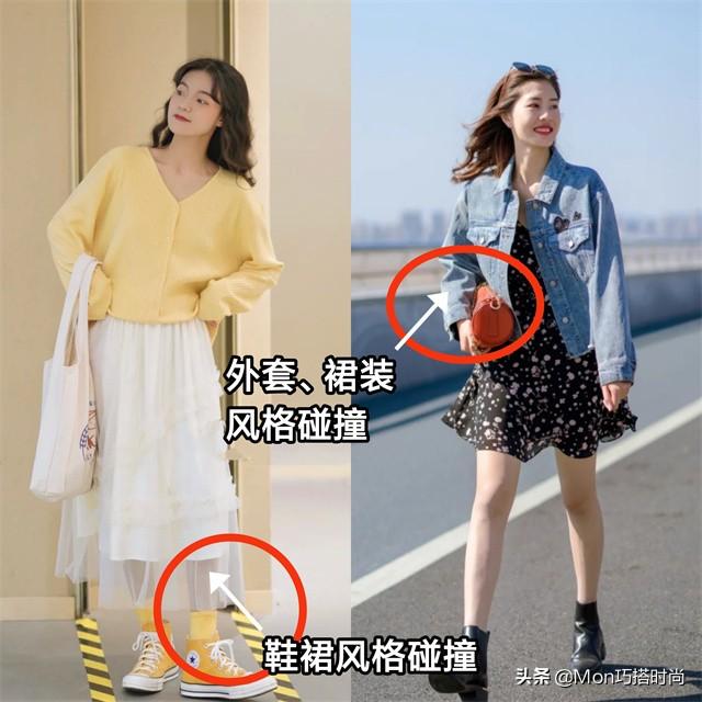 你可以为你的外套选择左边带有V型线或斜线的设计。腰部位置偏胖,也可以选择有硬度的直筒长外套。 脚踝纤细的女生穿低腰鞋,用裙子露出脚踝,更显优雅;脚踝粗的姐妹选择有一定厚度和宽度的鞋子,才不会很结实。 第三章:以“风格”为主体 (一)整体风格一致。 如果以风格为关键词为裙子选择大衣或鞋子,可以先把大衣、裙子、鞋子做成同一个风格。 比如第一套三件物品选择了英伦复古风设计;第二套碎花裙和裸色鞋也保持了同样的清新柔和,穿起来更加统一和谐。 (二)局部单一产品风格碰撞