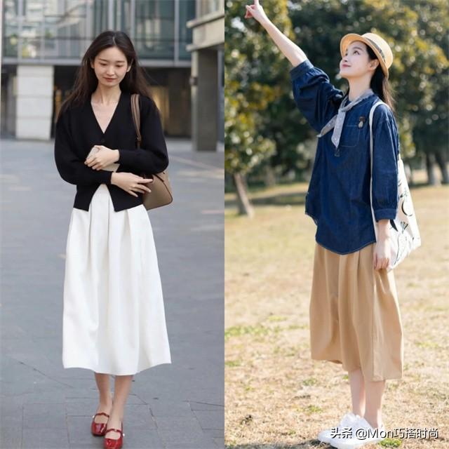 搭配矮个子女生的春裙也不会太简单。如果外套有一定厚度或者轮廓明显,就要搭配修身的裙子。长裙要搭配浅色,选择轻薄的外套和鞋子。 对于个子小的人来说,尽量不要选择平底鞋,裸色高跟鞋或者一定厚度的鞋子会显得更高。 (2) 50-50身材 五分位数的女生最重要的是增加身材比例。不管是长裙还是短裙,都要有高腰线才好看。 里面取一件可选的修身单品,塞进裙腰,最后搭配一件中短宽松外套。鞋子建议选择裸色或者浅色的高跟鞋,会让腿更长。 (3)微胖女生