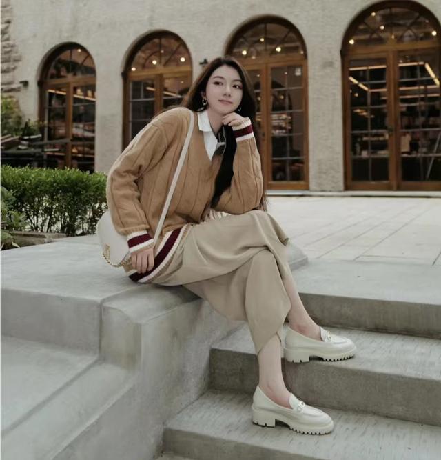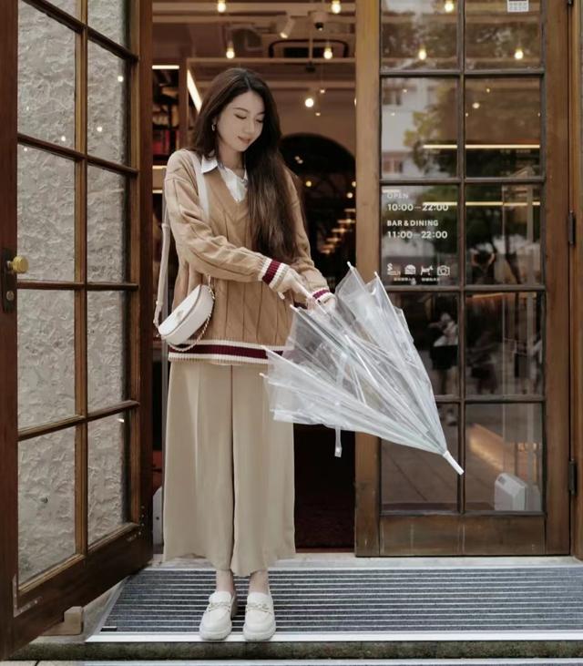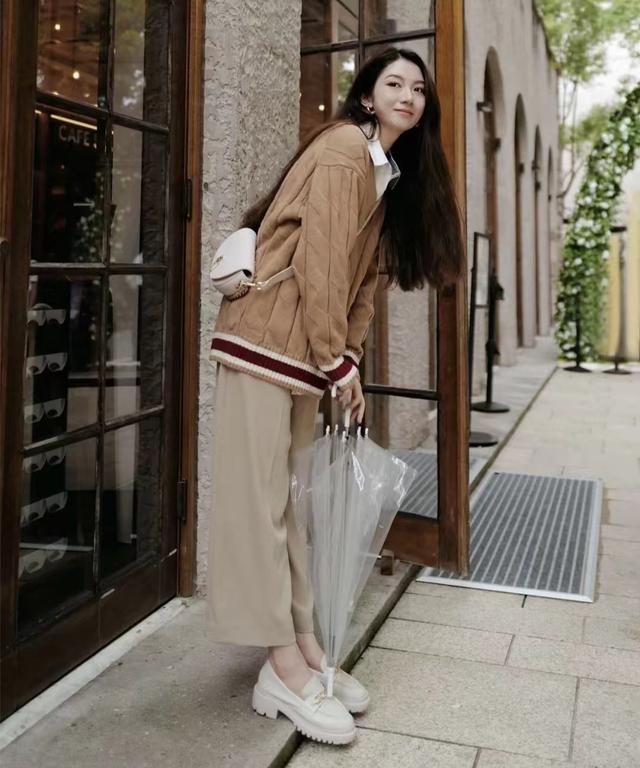 学院风与温度并存:针织毛衣外套属于秋冬色,撞色袖口和罗纹袖口做工非常细致,白色衬衫搭配针织毛衣学院风十足,整体很温柔~