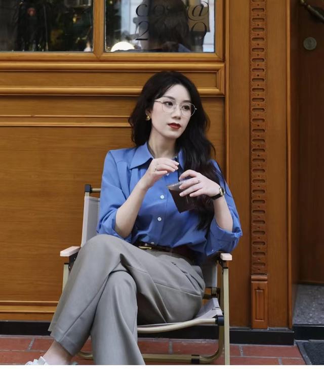 这件蓝色衬衫的颜色正是你想要的。这种织物抗皱。如果你穿卡其色西装裤和棕色腰带,那就戴上眼镜。知识分子穿get的时候,银色边框还挺温柔的~