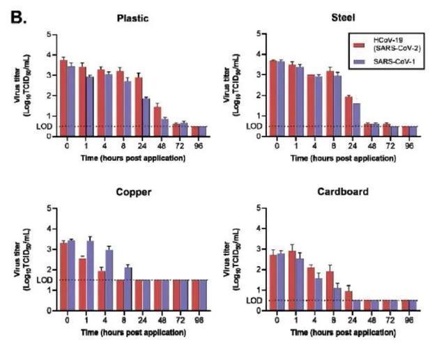 前段时间,美国国家卫生研究院、美国国家免疫与呼吸疾病中心、普林斯顿大学、加州大学洛杉矶分校等国际顶级科研机构联合团队,做了一项非常有趣的研究,专门研究新冠肺炎在气溶胶和其他物质表面的生存能力。 研究小组将新冠肺炎放入一个气溶胶装置中,然后将其喷入空气中,让病毒留在空气中,以模拟感染者咳嗽时可能发生的情况。接着,新冠肺炎跑向各种物体的表面,如铜表面、纸表面、塑料表面等等。然后,他们在不同的时间测试病毒的活性。 根据他们的研究结果, 在新冠肺炎气溶胶中可存活3小时, 在铜表面存活4小时, 在纸板上存活24小时, 并在塑料和不锈钢表面存活2-3天!