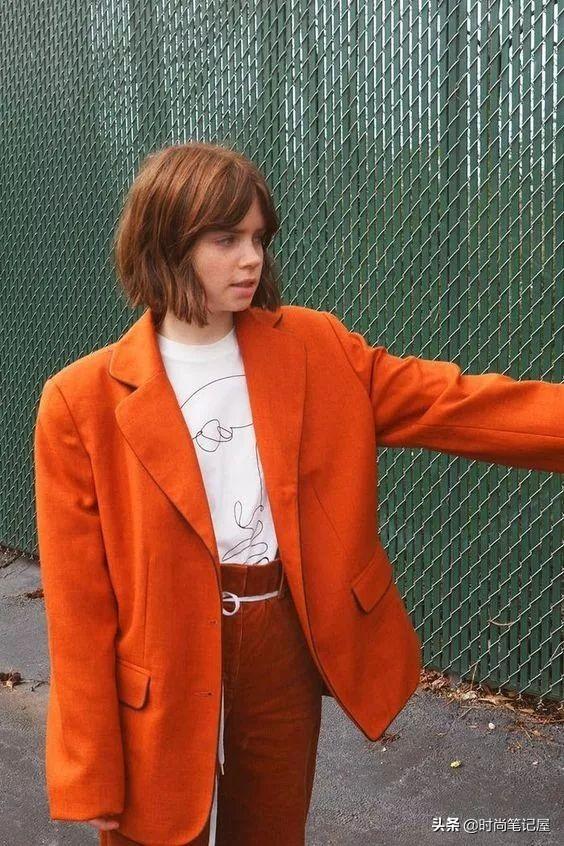 灵感搭配 1.白色t恤和橙色套装 秋冬穿西装怎么能避开西装?在一个黑色基础款站稳脚跟后,千万不要错过橙色套装。 橘色的衣服可以提升整个空间的温度,让整个气氛活跃起来。我最喜欢的博主就是擅长这种橙白搭配。