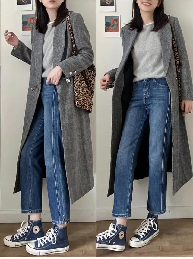 今年冬天好像流行人字呢大衣,内搭略显修身的灰色羊绒衫,牛仔裤一如既往的搭配七分裤,搭配匡威帆布鞋看起来很休闲~