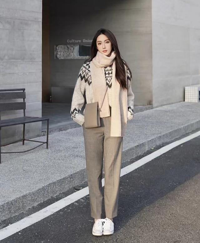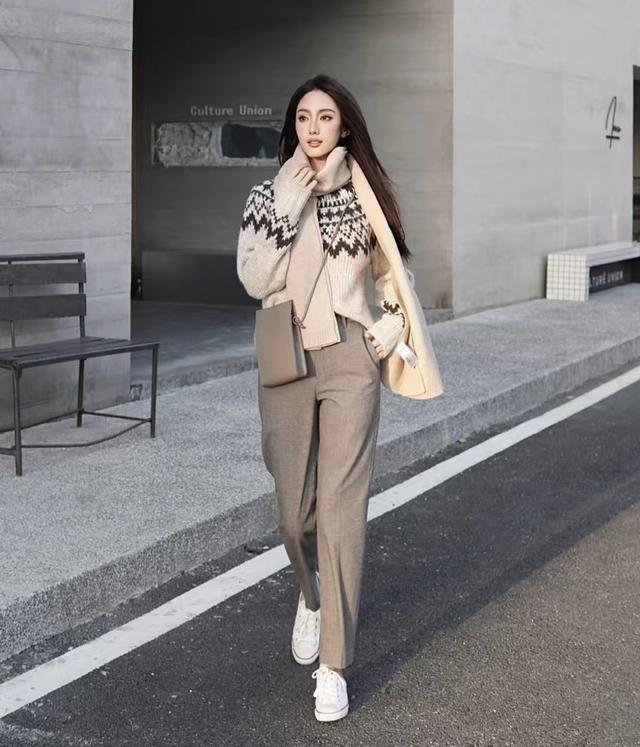 千格纹设计的麂皮弹力九分裤,触感舒适亲肤,九分长度显得人比例很好。一件Fairisland图案设计的毛衣让人感觉更文艺,加一条素色围巾就是一种温暖的感觉~