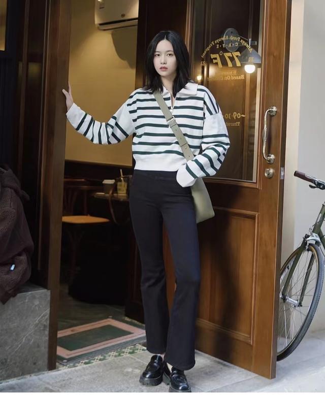 种草裤,建议小腿有点外翻的X腿妹子多尝试喇叭裤,腿型臀部包裹性好。九分裤长配黑色厚底乐福鞋,绿色条纹配同色系包包,好和谐在一起~