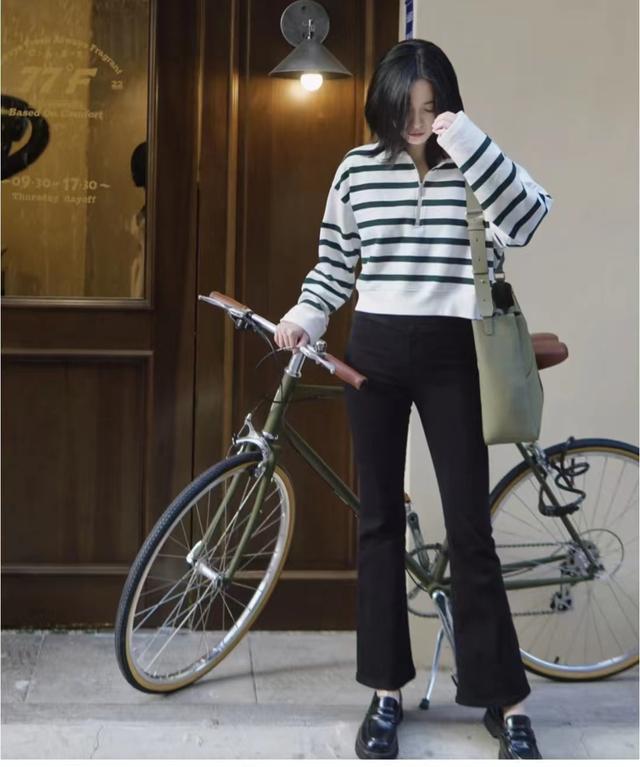 种草裤,建议小腿有点外翻的X腿妹子多尝试喇叭裤,腿型臀部包裹性好。九分裤长配黑色厚底乐福鞋,绿色条纹配同色系包包,好和谐在一起~