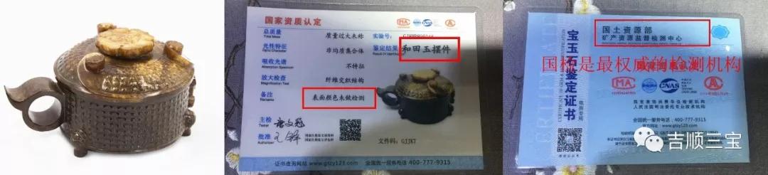 正规的老件和和田玉摆件 无论是老坑料,还是埋在地下太久的老物件,首先必须是名贵的玉石,就像是和田玉一样。不管是哪种方式出来的,出具的证书都是和田玉,不会改变其成分。但老片的表皮沾有包浆,所以证书上的备注会注明“表面颜色未检测”。