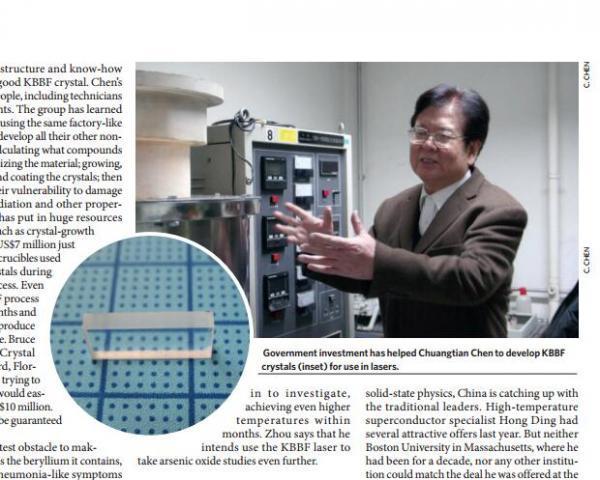 ![]() 肯定有人觉得不靠谱!中国什么可能超越美国呢?还能对美国技术封锁?实际上这个问题要从深紫外激光本身特性来说明,深紫外激光的是不相干性最好的激光。我们都学过物理,物理中光是广波形式存在的,有波存在就有相互干涉的情况。而深紫外激光就是人造激光光源中难得好光源,有了这样的光源对于精密加工测量有着重大的意义,加工精度更高,测量范围更准。不过整套深紫外激光发生光学系统和我们常见的紫外激光也不一样,因为绝大多数材料对于深紫外是不透过的,以至于要制造这套设备,单台造价成本就要上千万美元。国外虽然曾经投入巨资研制同类系统,不过因为太过昂贵,而且已经量子的极限,所以只能放弃。而中国人的锲而不舍,终究把这个东西给做出来了。 深紫外全固态激光器用途解密: KBBF是一种非线性光学晶体材料,它能够将激光转化为史无前例的176纳米波长(深紫外)激光,从而可以制造出深紫外固体激光器。中国花费了15年时间和数以百万计的美元才研制出世界上第一块KBBF晶体,这是由中国科学院陈创天院士领导的研究组(1990年发现)制造出来的,中国最初向全世界的研究者开放提供KBBF晶体。然而,到了2009年,中国意识到这种晶体的战略意义,随即停止对外出口。美国APC公司(联邦国有企业)与克莱门森大学合作从当时开始研制这种晶体,到今日APC公司成为了美国国内唯一生产这种战略性材料的企业。APC公司的KBBF晶体现在已经经过了测试和评估,并展示出了可与中国制造的同类产品相媲美的性能,并且在部分领域有所超越,这将大幅度降低这种材料的成本。 KBBF在高功率状态下紫外线性能比上一代BBO晶体性能好两倍,并能够用于制造超高速激光扫描设备,这将大大提高美国国防和国土安全威胁探测能力,对美国科学研究和精密测量能力的提高而言,KBBF具有“规则改变者”的意义。目前APC公司还在继续进行这种产品的开发。 (APC公司声明译完) 观察者网军事评论员表示,据国内相关资料,我国最早在1990年发现KBBF晶体,这种晶体是我国科技工作者首先提出并研制成功,在紫外线波段性能全面优于当时已经发现的任何材料。它的研制成功在国外引起巨大反响。 1990年时中国用这种材料实现了低至204.8纳米相位匹配的二次谐波的发生。它是用于短脉冲 2013年9月9日,中科院网站公布,我国深紫外固态激光源系列前沿装备日前通过验收,我国成为世界上唯一能够制造实用化深紫外全固态激光器的国家。 报道提到,上世纪90年代初,在发现硼酸盐系列非线性光学晶体后,中科院院士陈创天的研究团队经过十余年的努力,在国际上首先生长出大尺寸KBBF晶体。 KBBF晶体是目前唯一可直接倍频产生深紫外激光的非线性光学晶体,是在非线性光学晶体研究领域中,继硼酸钡、三硼酸锂晶体后的第三个“中国产”非线性光学晶体。 关于KBBF晶体基础上制造的深紫外波段激光的应用,文章提到,如今,这8台科学仪器已经在石墨烯、高温超导、拓扑绝缘体、宽禁带半导体和催化剂等研究中获得了重要结果。 以深紫外激光光发射电子显微镜(PEEM)为例,目前国际上最先进的光发射电子显微镜空间分辨率最高为20nm,而采用全固态激光器后能提高到3.9nm。中科院大连化物所利用这台仪器开展了石墨烯/Ru(0001)表面插层反应原位观测,为石墨烯等光电子材料发展和应用提供了强有力的研究手段。 詹文山透露,目前2mm以下的KBBF晶体已可小批量生产,满足国内市场需求。8台科学仪器中,PEEM正在逐步进行产业化尝试。 “晶体—光源—装备—科研—产业化,深紫外固态激光源前沿装备研制项目打造了一条自主创新链,涵盖了从提出原创科学思想到实现应用成果这一完整的科学价值链,为学科交叉面广、跨度大、探索性和工程性很强的原创性重大科研装备创新积累了经验,也为中科院各业务管理单元合理分工、深度融合、协力创新提供了典型样本。”白春礼评价道。 ![]() 美国《自然》杂志文章刊登陈创天院士和他的KBBF晶体,文章中提到,美国曾试图重金聘请陈院士到美国,被拒绝 “这仅仅是深紫外波段仪器应用的开始。”许祖彦透露,项目二期将从物理、化学、材料拓展到信息、资环、生命等领域,开展6台国际领先水平的仪器设备研制工作,继续推动深紫外技术的深度开发。 同时,在一期任务顺利完成基础上,去年中科院理化所联合北京中科科仪等单位,在科技部支持下启动了深紫外仪器设备产业化开发工作,逐步将研制成功的深紫外仪器设备推向市场。 美国在KBBF晶体制造技术方面的追赶是从2009年开始的,当时美国《自然》杂志刊登文章称,中国开始禁运KBBF晶体,将对美国相关领域的研究产生严重影响,呼吁开始研制美国自己的KBBF晶体。 据查询,正是从2009年开始,美国政府开始直接对APC公司的KBBF项目拨款,项目启动资金约15万美元,此后又在2011年追加50万美元,完成了项目相关预研。此后进入正式的研制开发阶段,迄今项目耗资“数百万美元”(具体数字没有查询到)。 ![]() KBBF是制造1兆瓦脉冲激光器的理想材料,美国YAL-1激光反导试验飞机的发射功率就是1兆瓦。不过,深紫外波段激光在大气层内没有实用意义,很容易被大气吸收 ![]() 资料显示,美国在70-80年代研究太空激光武器的时候曾研究深紫外波段的激光(176纳米波长)拦截来袭洲际导弹的可行性。 陈创天院士简历: