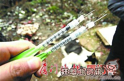 他们用来毒杀狗的毒镖类似于注射针管,针头连着塑料管,氰化物就放在塑料管内,塑料管内还有弹簧,尾部有针叶。