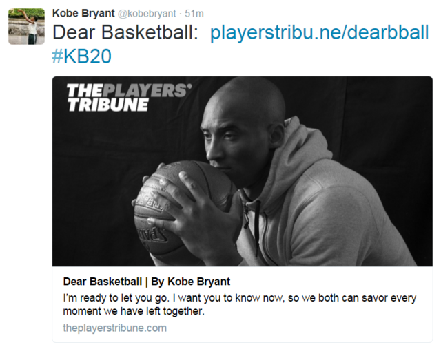 “这个赛季已经是我最后能够贡献的全部了。”科比在信中写到,“我的心还能够接受打击,我的意志还能让我继续坚持,但我的身体知道是时候说再见了。没关系,我已经准备好了。”