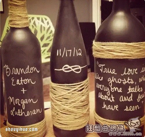 去化工油漆店里买到黑板漆,均匀喷涂在酒瓶上,然后再做一些简单的装饰,一块360°酒瓶小黑板就制作完成啦。