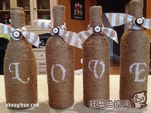 制作一个麻绳酒瓶很简单,绳子一圈一圈地要码紧,白乳胶不能一次性全部刷完,麻绳断了有接头会不好看。