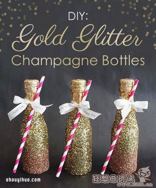 女孩子们看到它,肯定爱不释手。一定要用最小的187ml装香槟瓶,大的显得很笨很愚蠢。金金粉可以选择颗粒大一点的,太细的会掉粉末拿起来会粘得满手都是。你需要准备的是没开过的小香槟。把它们放到礼盒里,可以堪称史上最有爱礼物了!