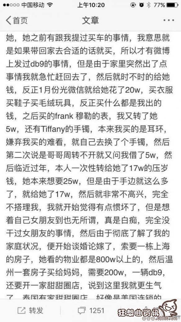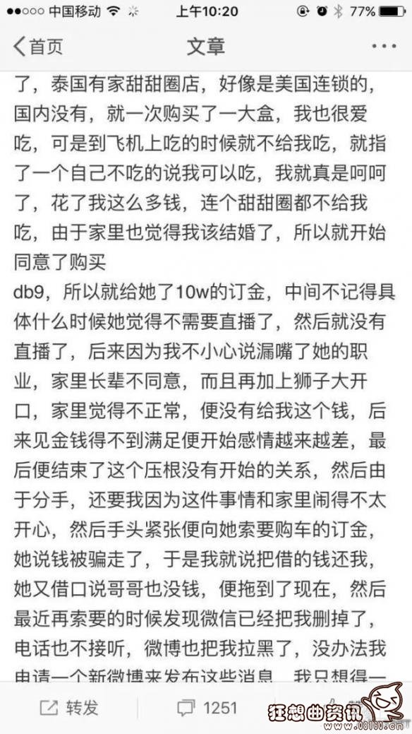 如今女主播这个行业之所以这么火爆,和土豪们的投资不离不开的。许多土豪为了自己喜欢的女主播,不惜送上万礼物,只求博得主播一笑,当然,这其中不乏花大价钱私下约女主播的。这不日前,微博上一位土豪发帖爆料,自称对某平台第一美臀女主播心生爱慕,投入巨额财产带女主播出去旅游,买奢侈品,甚至谈婚论嫁。但万万没想到女主播并不爱他,甚至将他从联系人中拉黑删除。土豪无奈发文:“请还我钱,谢谢!”