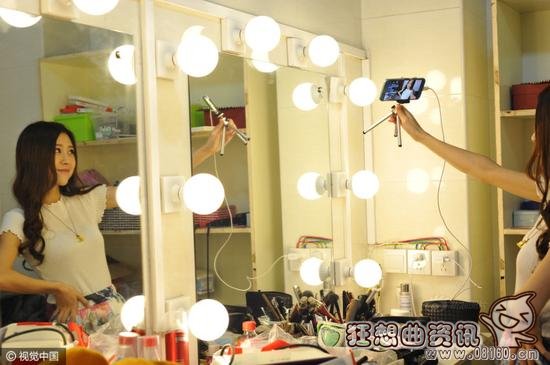 化妆前,她先拿出手机、小三脚架、移动wifi、无线音箱,熟练地打开摄像头,对准自己,测试网络。日常生活、工作等等都常被欢欢拿到直播中和粉丝分享,这天,她的直播内容是自己拍平面广告。