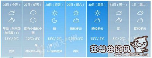 北京市气象台26日6时发布天气预报,今天早晨东南部有轻雾,白天多云转阴,北风二三间四级转东风二级,最高气温15℃;夜间阴天间多云,东风一二级,最低气温9℃。