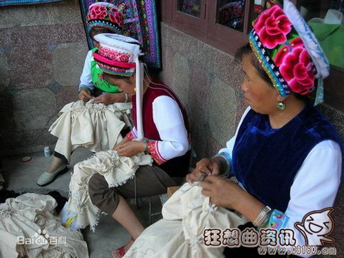目前是大理白族的特色产品。80%以上销往日、英、美、加等10多个国家和地区,供不应求。这里,妇女们个个在扎花,户户在入染。已成为重要的扎染织物产地