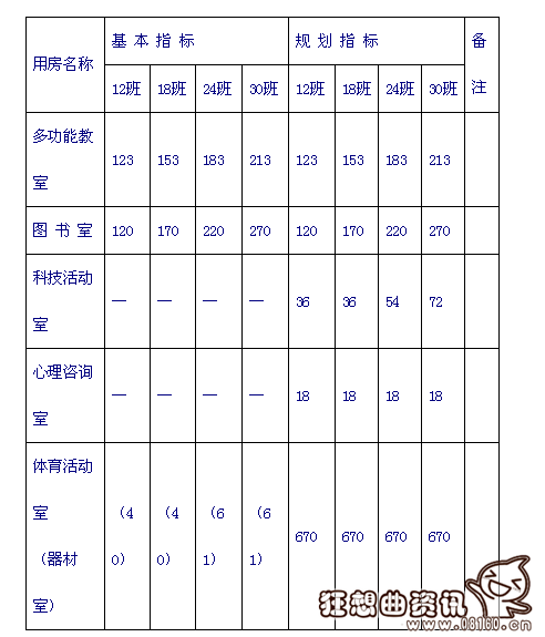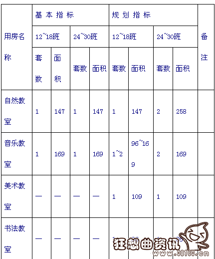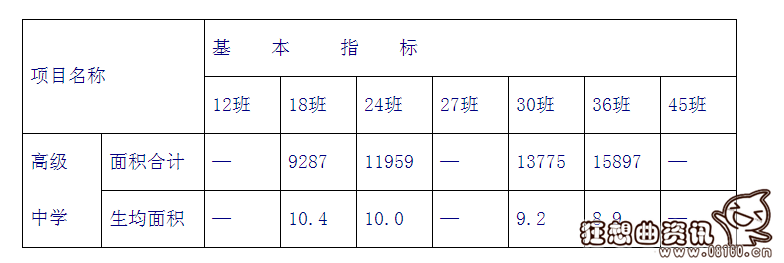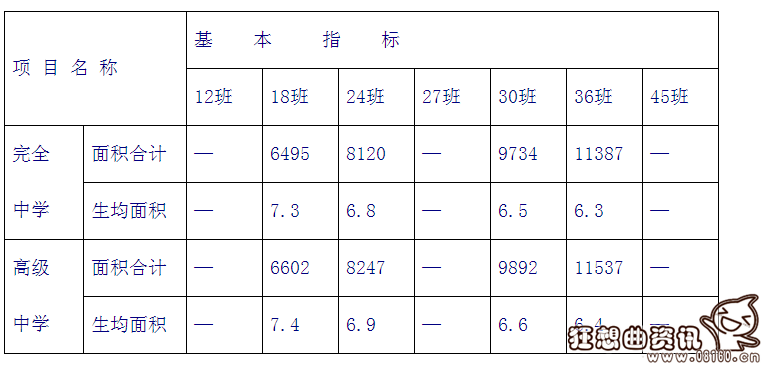 4、完全中学:设置普通教室;实验室、音乐教室、美术教室、书法教室、地理教室、语言教室、计算机教室、劳动技术教室等专用教室及辅助用房;合班教室、图书馆、科技活动室、心理咨询室、体育活动室等公共教学用房及其辅助用房。