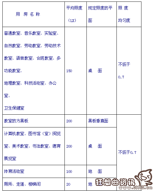 二、照明。教学、办公用房应采用配用保护角灯罩的荧光灯具,不得用裸灯。教学用房照明灯具的数量、功率、布置方式和悬挂高度必须满足照度均匀度的要求,达到规定的照度标准。灯具悬挂高度距桌面不应低于1700mm。生物实验室的实验桌上宜设局部照明。教学用的照明要能够分楼、分层、分部位控制。各类用房的平均照度不应低于表5-1的规定。