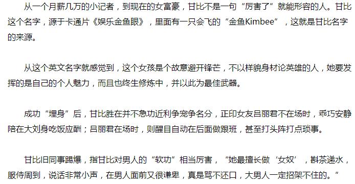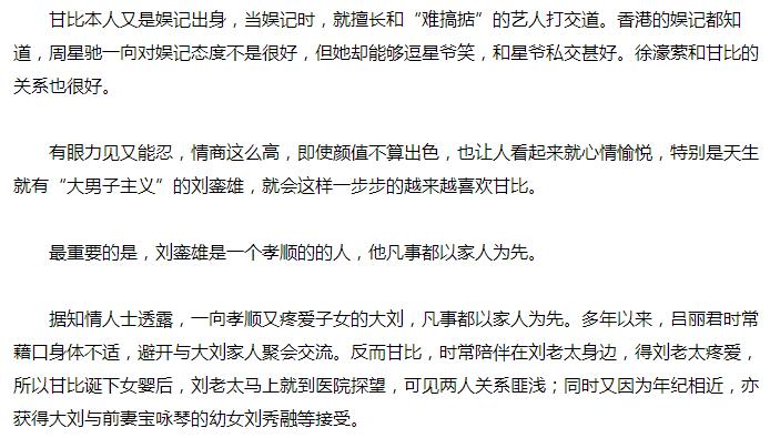 说到甘比,大家应该不会陌生,去年一度成为许多搜索引擎热搜之一的甘比上位事件,由一个娱乐记者成为香港富豪刘銮雄的红颜知己,至今正式成为其身边的贤内助,期间也经历了不少事情,要知道在甘比与大刘结婚之前,大刘身边一直都是那位与其相恋了14年的女博士吕丽君,甚至期间两人还共同在大刘身边,经过了许久甘比才成功上位,可能许多朋友会说甘比能成功上位是因为她漂亮,但实际上大刘自己也说了甘比并不是自己身边众多红颜知己里最漂亮的,但为什么大刘就是喜欢她?有人说是因为甘比情商高,她情商高的具体表现在哪?让我们一起来看看!