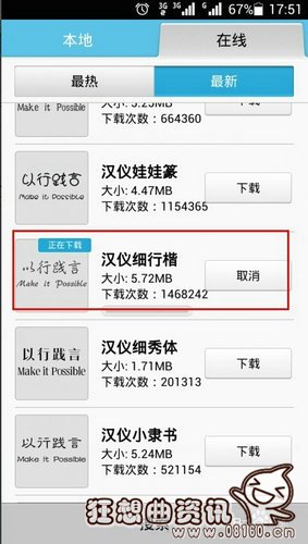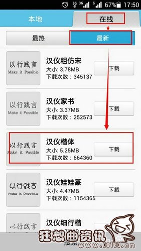 6、在“在线”的页面里选择“最新”,就看一看很多字体。