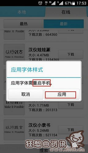 8、下载完毕之后,点击应用。而这时则需要重启手机。