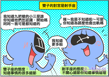 什么是对攻星座? 十二星座星盘中对面的那一个就是你的对宫星座,比如水瓶座的对宫星座是狮子座,双鱼座的对宫星座是处女座,白羊的对宫星座是天秤,金牛的对宫星座是天蝎,双子的对宫星座是射手,摩羯的对宫星座是巨蟹座。 对宫星座合适做恋人吗? 答案是否定的。对宫星座男女之间的恋情就像灿漫的烟花一样,壮美炫目但是一瞬即逝。 对宫星座虽然是距离最遥远的两个星座,但是他们却有着神奇的共性,和互相吸引力。对攻的两个星座的男女一见钟情几率是最高的,这为成为恋人打下了基础,但是这种吸引力往往维持不久就会消亡,两个星座之间的冲突会让爱情保鲜期很快失效。 白羊座受不了天秤座优柔寡断的性格,而天秤座无法忍受白羊的冲动。 天蝎座不理解金牛对物质欲望的追求,而金牛也无法认同天蝎报复心。 双子座认为射手们很傻思想太简单,射手们却觉得双子座就像小孩爱装大人一样的幼稚可笑。 巨蟹座讨厌摩羯座只顾着工作又偏执,而摩羯座不喜欢巨蟹座喜欢粘人。 狮子座和水瓶座都是自恃聪明高人一等的性格,所以他们互相看不上对方。 处女座不喜欢双鱼们的矫情,爱装弱小装无辜白莲花、绿茶婊的性格,而双鱼座鄙视处女座爱装的高贵圣母。 |