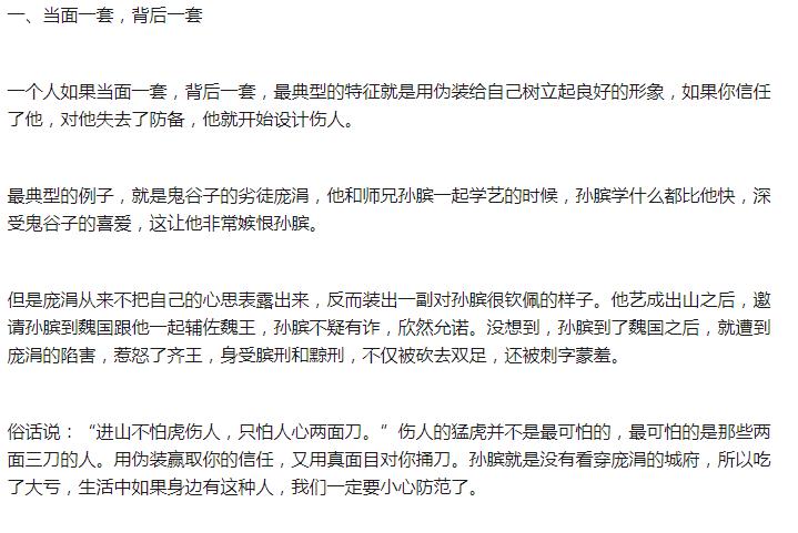 第一、当属天蝎座! 天蝎座的女人非常的聪明,为人处世有很强的技巧,她们深知要想处理好人机关系,面善是必须的,这是最好的伪装! 但是面善的背后,却有她们真正的利益考量,她们绝对不会损害自己的利益,为了达到自己的目的,心狠起来绝对毫不含糊! ![]() 第二、当属双子座! 双子座人如其名,两面派,外貌上,双子座的女孩可以表现的人畜无害,活泼可爱,但是她们的另外一面,鬼才知道是什么样子! 当然不是说每个双子座都是面善心狠,但是双子座的女人往往在外面和在家展示出完全不同的一面,所以面善心狠是一点都不奇怪的! ![]() 第三、就是为人看起来非常憨厚的金牛座了! 金牛座,表面上看为人谦和憨厚,但是她们憨厚有一个条件就是我对你好,你对我也要好,金牛座的女人是绝对不允许自己吃亏的,一旦你对不起金牛座的女人,憨厚就会变成睚眦必报,就会变成一根筋的收拾你,而且毫不含糊! 金牛座的面善心狠都是被逼出来的,而且一旦爆发出来,是最狠的! 我们在生活中,往往是不知道一个人的星座的,那么面善心狠的人有什么特征吗??当然是有的!主要是以下几个特征: 1、聪明,人要狠,光自己发狠没意义,你得有足够的手段,而足够手段的背后需要有足够的智商来支撑! ![]() 2、面善心狠的人,往往人际交往能力极强,游刃有余的处理各种复杂的人际关系!他们会根据自己的需求来进行切换善良或者狠毒! ![]() 3、情商极高!耍两面派的人情商低了,很容易被人发现出破绽,面善心狠必须有有极高的情商,知道如何对付一个人! ![]() |