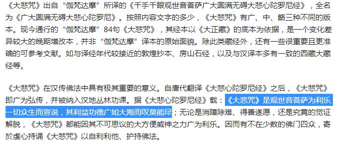 虽然大家在日常生活中经常会听说“大悲咒”,但是真正了解大悲咒的人肯定是少之又少。大悲咒是一个佛教用语,全名是《广大圆满无碍大悲心陀罗尼》,属于藏传佛经的一种。大悲咒是由伽梵达摩所译,由广、中、略三个版本,现在大家经常听到的是84句的略版,大悲咒也是观世音菩萨普度众生的口诀。