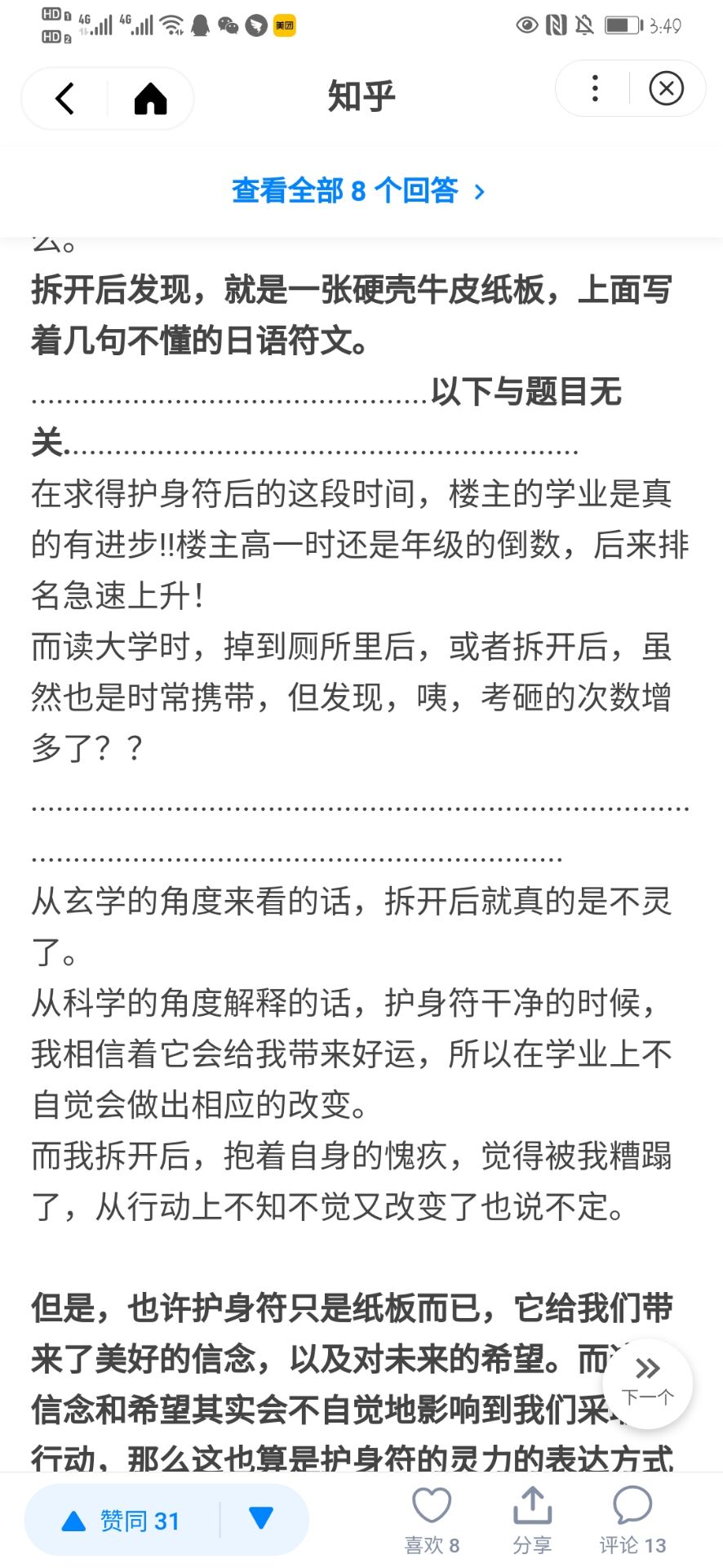 ![]() 但不同地方,不同寺庙也是因人而异的,所以说并不能直接了当的的说护身符里都装有什么,只能够大体而论。 ![]() 而也有不少人问,护身符可以放在手机壳里吗?其实我个人觉得护身符是可以放在手机里面的,因为当今社会手机已经成为我们日常身边的一个必备品与我们“形影不离“,而护身符是保护拥有者的,手机与我们可以说是没有距离,并且可以真正的做到形影不离随身携带,所以我认为只要护身符的介质和作用不会被手机壳干预,并不会与手机壳发生化学反应,那么就可以放心的放在手机壳里。 ![]() 其实不单单是中国有护身符这种东西,其实国外也有这种趋吉避凶的东西,只是名字或者意义不同,比如十字架一类的。而护身符就是古时候祖先为保护自己的工具与手段或者说是美好期望,现如今科技越来愈发达,我们也不要完全去依赖护身符,护身符是有用的,但我们也要提供高和锻炼自己的能力,让自己更加强大,我们求护身符也正常而我也不反对去求护身符毕竟是多一重保护对我们没有害处,同时呢我们如果有护身符一定不要去拆开,否则他的功能可能就会生效奥。下边就这张图就说明了。 ![]() |