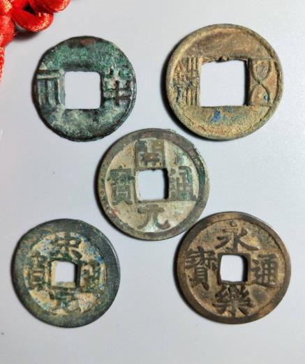在民间有用“五帝钱”来辟邪免灾的说法,传说五帝钱可以化煞气、挡灾祸、可以随身携带,也可以挂在家中。五帝钱之一所可以挡煞辟邪是因为他们拥有帝王气息、天地合一、天神合一、千万人用过。另外,五帝钱有小五帝钱和大五帝钱之分,所谓的小五帝钱是指的清代时候五位皇帝时期发行的圆形方孔钱,主要包括:顺治通宝、康熙通宝、雍正通宝、乾隆通宝、嘉庆通宝,这五位皇帝是清代鼎盛的时期,如下图: