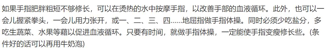 “小手抓宝”这四个字不知道大家有没有听到过,意思是说一个人如果手比较小又比较丰满,那就是比较有福的,那么如果是比较有骨感的手,是有福相的吗?命运好不好呢? 关于有骨感的手的命运主要有两种说法,其中一种说法是这样的: 手指细长,没什么肉,比较有骨感,合并手指时不能完全合拢,有空隙漏出,则命运不好。这种类型的有骨感的手,代表了钱财总是容易流走,无法守住,生活会比较困苦。这是一种劳碌类型的命运。 还有另一种说法是这样的: 手很有骨感的同时,又不是很大,比较的小,则命运很好。这种类型的有骨感的手,代表了家业比较丰厚,不需要自己亲手劳动,吃穿用度不需自己操心,福气多多。 其实命运好不好,也不能光看手,还有面相等等也是相辅相成的,要互相考虑才是。 不过,有骨感的手确实还是很好看的,尤其是对于手控来说,如果遇到那种特别细长有骨感的手,怕是眼睛都挪不开了吧。 那么有骨感的手可以自己练吗?是怎么练出来的呢? 首先,要多多对自己的双手进行按摩。力道要轻柔。 其次,要对手指做拉伸运动。通常是两手的十指相握,然后向外拉伸。 然后,经常双手分开,十指朝上,然后向上用力自然伸展。 还有,经常练习弹钢琴,这样也比较容易练出有骨感的手。 当然,多多练习打字也是不错的方法。 下面是网友们关于练出骨感手的一些方法,大家也可以参考一下: