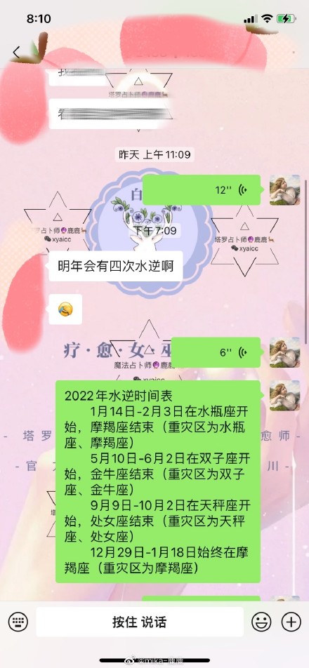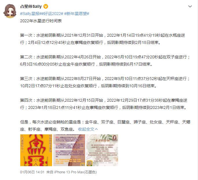 有一个说法是,水逆期间不要买电子产品,因为容易坏。主要的说法是水星逆行期间,会影响磁场,从而导致电子产品出现问题;再就是因为磁场改变,还影响了人的记忆力和情绪,导致交通违章增加,工作上出现问题等等。其实小编倒是觉得,水星逆行期间,这点磁场的改变还不能足以让人体察觉到,从而出现一些问题。 ![]() 当然,不管如何,做人凡事小心点为好,在水逆期就“老老实实”、谨慎行事,别整幺蛾子,下面给大家分享2022年的水逆时间表,以及影响到的对应星座,希望大家在今年的这些个时期,多多注意。 一下内容摘自微博用户@占星师Sally: ![]() 其实破解水逆的方法很简单,大吼一声“水逆退散”,吓跑水逆和小人~或者心中常常默念“水逆退散”即可。我已经默念三遍,你呢? ![]() |