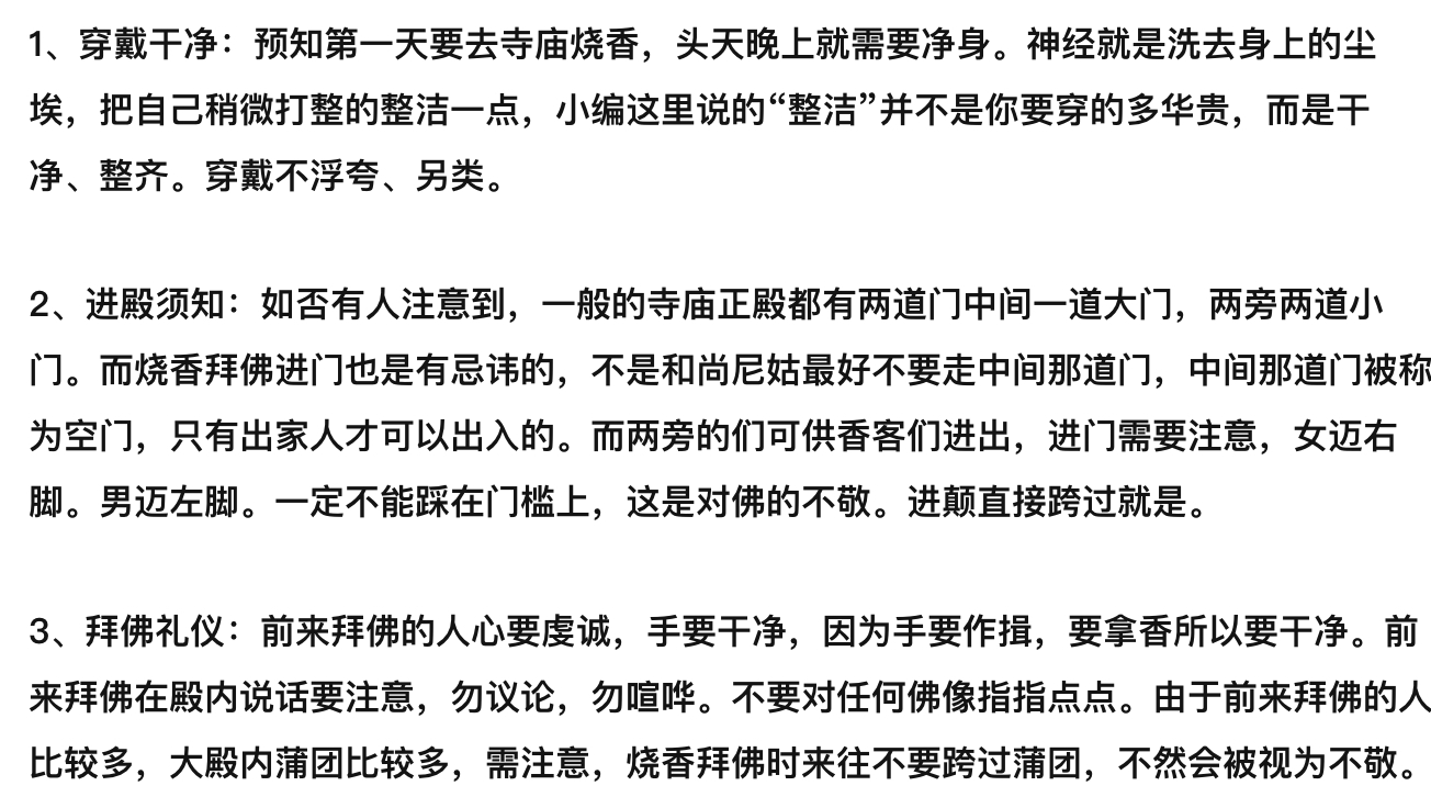 寺庙现在大多数都是具有观赏性的,不过大多数人进入寺庙后,总是会忍不住上柱香,因此越是香火旺盛的寺庙,人就会越多,灵不灵不知道,但大多数人在上香的时候都是非常虔诚的,那么在寺庙中上香跪拜的正确方法是什么? 其实去寺庙上香的时候,一言一行都是要很讲究的,比如说在拿香的时候,要说是“请香”,而不是“买香”,而且很多人在上香的时候不注意,觉得上香是越多越好的,但其实并非如此,一般三柱香就可以了,在点香的时候,也不能用嘴吹香上的火,而是用手轻轻扑灭。 在上香跪拜的时候,需要合掌,但是掌背需要微微弯曲,合掌的中间是虚心的,其实就是合掌不能太低,当然也不应该太高,和胸部持平就可以了,下跪时脚应该打直,重心在后,手掌摊开,按在垫子上,不要用双手虚撑,然后额头要接触地面,也就是人们常说的“五体投地”,起来的时候需要右手撑起身体,左手放在身前,在合掌行礼。 寺庙上香跪拜正确方法 其实上香的时候规格和禁忌是很多的,首先就是需要沐浴更衣,身上不要有异味,最好是干净整洁,不要穿奇装异服,其次进殿的时候不要走正门,因为那是“空门”,是出家人走的,还有香的数量,一般都是三柱、六柱、九柱香等,还有就是在上香的时候,女性来例假,手上或者脸上不干净,或者衣服不够正式,比如说大裤衩或者超短裤等,都是不宜上香的。