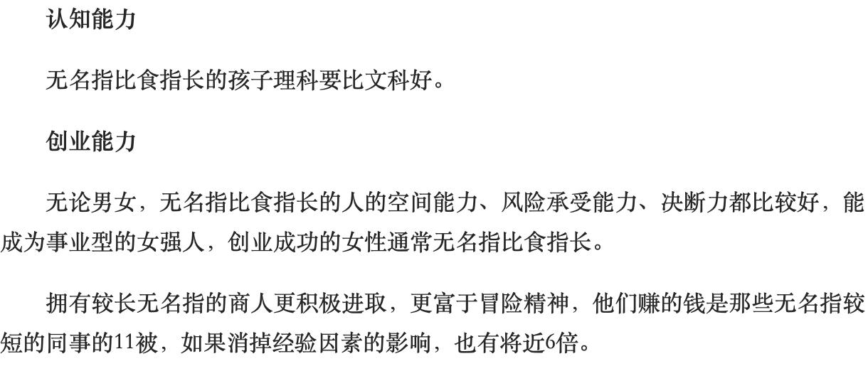 在日常生活中,人们并没有觉得自己的双手有多重要,但是一旦手受伤的时候,就知道没有手有多不方便了,有句话叫做“五根手指有长有短”,因此五个手指的作用是不一样的,而且从古至今,“手相”这门学问都是非常玄妙的,那么无名指和中指差不多长是什么意思? 人的五根手指,被依次命名为大拇指、食指、中指、无名指和小拇指,一般在五根手指中,中指是最长的,但是也有些人的手指很特殊,比如说有些人的无名指比食指长,有些人的无名指长度接近于中指,从手相上来说,手指的长度和人的命运息息相关,那么无名指比食指长有什么说法? 在手相学上,一般认为无名指和中指差不多长,或者一样长的话,代表这个人是好赌的命,这类人会很喜欢赌博、好逸恶劳,总是会做一些天降横财的美梦,但又不会付出实际行动,所以这类人基本上都不会有太大的出息,反而可能会越活越差劲,因此有这种手相的人,都是不太好的命。 在生活中,很多女性的食指都不如无名指长,从手相学上来说,一般无名指比食指长的女性,大都是理性思维大于感性思维,而且她们的理科比文科好,再加上她们都具有冒险精神和开拓精神,因此创业的话,成为女强人的几率很大,但是这也并不是绝对的,毕竟大多数女性,都没有成为女强人的决心,所以像董明珠那样的女强人才会如此罕见。