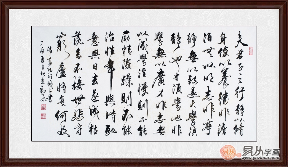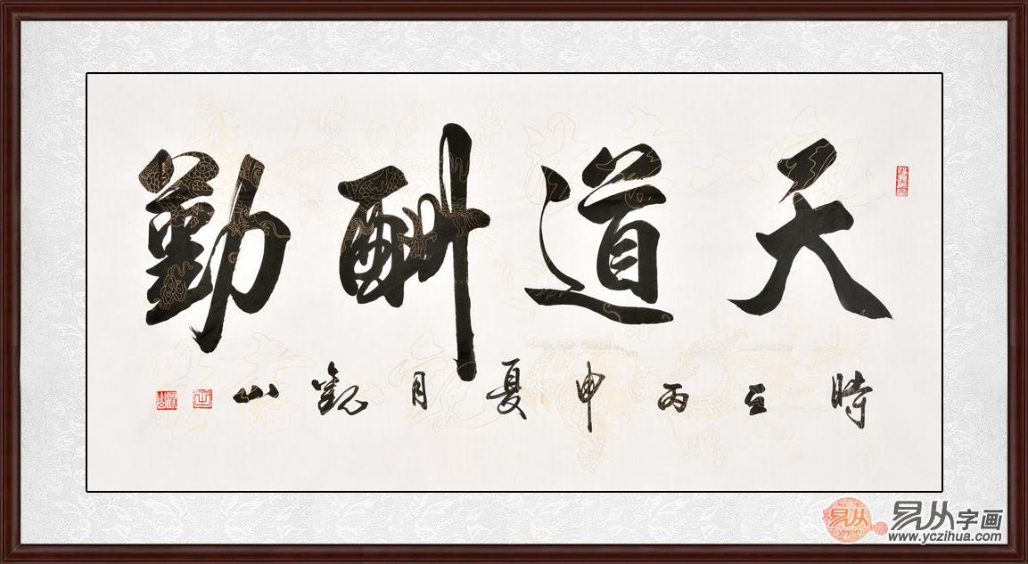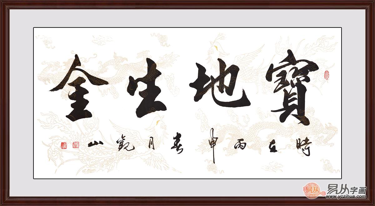 招财聚宝 日进斗金 国宾礼书法家观山书法《宝地生金》 三、有的人需要鼓舞,想自我勉励,或许他会在家里客厅挂幅经典的励志书法作品。比如天道酬勤、自强不息、“天行健君子以自强不息,地势坤君子以厚德载物“、精气神、积健为雄、龙马精神、持之以恒、马到成功、“业精于勤荒于嬉,行成于思毁于随”、志存高远、高瞻远瞩等。