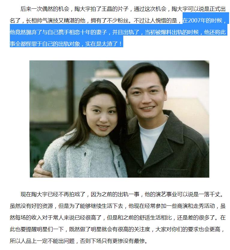 陶大宇算是一线明星吗 现在的很多年轻人可能并不知道陶大宇是谁,但是在80、90年代他也是红极一时的小生。 陶大宇是香港演员出生于1963年,1983年开始进入演艺圈,第一部戏叫做《北斗双雄》,之后他还出演了《壹号皇庭》《刑事侦缉档案》《纵横四海》等电视剧,他最出名的角色要属在《刑事侦缉档案》里面的张大勇一角,帅气的形象让人印象深刻。凭借这角色他也获得壹电视大奖十大艺人第一位,在当时属于一线明星,现在肯定不算了。 但是在1997年以后他和TVB的合约到期,转投亚视之后就没有什么骄人的成绩了,而且因为第三者插足和发妻离婚也是他事业衰落的一个重要原因。 后来陶大宇转投内地,但是事业一直也没什么起色。 他现在为什么不火了 现在的陶大宇不火最主要的是因为出轨事件,2007年他抛弃自己的发妻,出轨导致直接被冷藏 ![]() 此外,不火的原因还可能有以下两点: 第一,现在的娱乐圈发展速度快,竞争激烈。很多小鲜肉片酬低、演技好,很容易出现长江后浪推前浪的情况。TVB的很多大牌艺人都选择了隐退。 第二,从香港转投内地的陶大宇并没有接到特别适合自己的角色,再加上他在内地的知名度并不是很高,所以就不是很火。另外,他和郭羡妮因为合作电视剧假戏真做,抛弃自己已婚7年的妻子黄慧宝,被盖上了渣男的印章也是一个原因。 在娱乐圈有句话叫做“花无百日红”,所以不可能有人一直保持热度,这也是一个正常现象。 |