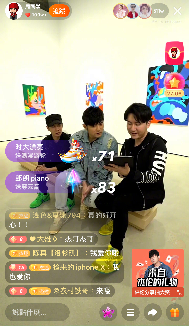 在7月26日周杰伦在快手直播,吸引了大量的明星关注,王祖蓝在直播间一口气给周杰伦刷了700个穿云箭,整个直播间热闹非凡!大家都知道穿云箭是快手最贵重的一种礼物之一(目前最贵的是游乐园6666快币),每个2888个快币,折合人民币288元,这么一算王祖蓝昨天晚上给周杰伦刷了20多万的穿云箭,官方扣掉一半,周杰伦到手10万元。
