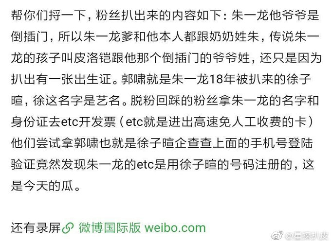 ![]() 最近在娱乐圈曝光了一个大瓜,传言朱一龙已经隐婚生子,当年在微博之夜的晚会上,主持人说让“未婚的站出来”,当时朱一龙就没站出来,为其隐婚埋下过伏笔,还曝光了朱一龙的父亲当年是倒插门进入现在的家庭,朱一龙父亲本来姓皮,入赘后改姓为朱,根据当地风俗“三代还宗”,也就是说朱一龙父亲的孙子辈的孩子就可以改回朱一龙父亲原本的姓“皮”,所以传言朱一龙的孩子已经改回皮姓,叫皮洛铠。 ![]() 反对者认为之所以网传朱一龙姓皮是因为他曾经参演过《家宴》这部剧,在剧中,他饰演的角色叫冯豆子,而剧中的皮姓是冯豆子二姐夫的姓。 ![]() ![]() 此外,传的沸沸扬扬的还有朱一龙的隐婚妻子,郭啸,她的原名叫徐子萱,跟朱一龙是十多年的大学同学,下面是她的照片 ![]() 目前来看,朱一龙的这个瓜很生,不熟,很多疑点,建议广大网友谨慎吃瓜,慢慢等当事人出来辟谣吧! ![]() |