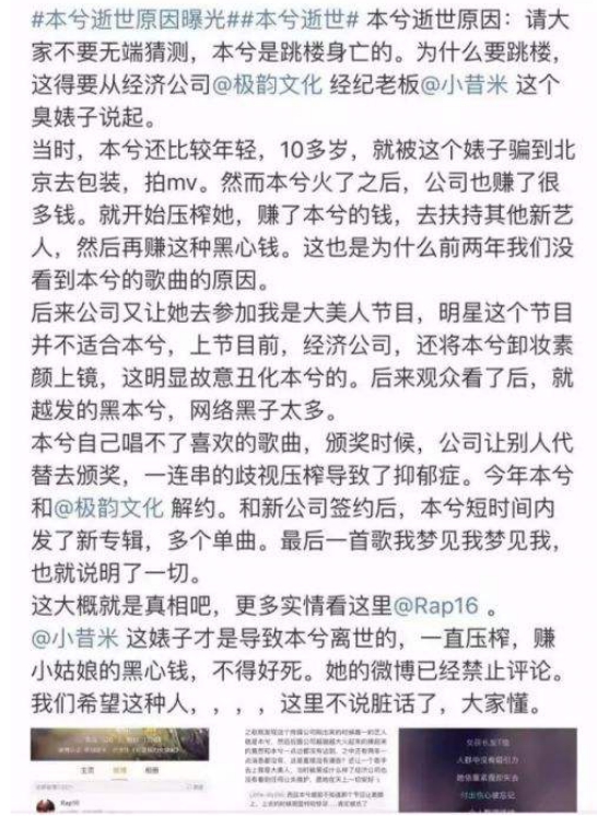 网络歌手本兮的突然去世曾经轰动一时,而对于本兮离世的原因,本兮工作室和家人也都缄默不言,让外界网友们议论纷纷,当时本兮去世的时候,只有22岁,是一个女孩最美好的年华,那么本兮去世的原因是什么? 本兮是个很有才华的女孩子,原名叫做马晓晨,她从15岁时就开始在网络平台上发表原创歌曲,17岁正式踏入歌坛,发表的歌曲有《未成年》、《未限速》、《蓝色的海》、《泡泡泡泡》等 ,其实本兮的个人风格十分突出,所以从网络歌手成功转型,获得了“大众音乐最佳新人女歌手”的殊荣,受到了主流音乐的认可。 网传小昔米和本兮矛盾 其实年少成名对于艺人来说有利有弊,他们受到的舆论攻击是普通人想象不到的,尤其是本兮这种本来就很有争议的歌手,就更容易受到外界的抨击,在本兮去世的时候,舆论才一边倒的同情起这个女孩,只是对于本兮来说,这都已经太晚了。 在本兮去世后,很多网友都把矛头对准了她的经纪人小昔米,小昔米原来是华谊的经纪人,后来加入极韵文化,很长一段时间小昔米都是本兮最为亲近的一个人,不过后来本兮突然和经纪公司发生了经济纠纷,甚至闹上了法庭,因此外界传闻经纪人压榨本兮,让本兮最后一时想不开选择自杀。 本兮在去世之前,几乎毫无征兆,当时经纪公司的过度打压和压榨,外界舆论的不友好,以及前经纪公司的赔偿金,都让这个年轻的女孩感受到了世界的不美好,所以她的歌词大都非常消极,所以后来她的离世才会让网友猜测是自杀。