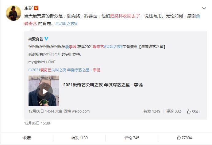 近日爱奇艺因为“太抠”登上了微博热搜,起因是这样的,李诞刚刚获得的了由爱奇艺评选颁发的“尖叫之夜”荣誉盛典年度综艺之星,结果奖杯还没捂热乎,就被工作人员收回,说还有用,蛋总不乐意了,感到特别荒唐,把这件事发上了热搜,语言虽然风轻云淡,但能感觉里面的不高兴。