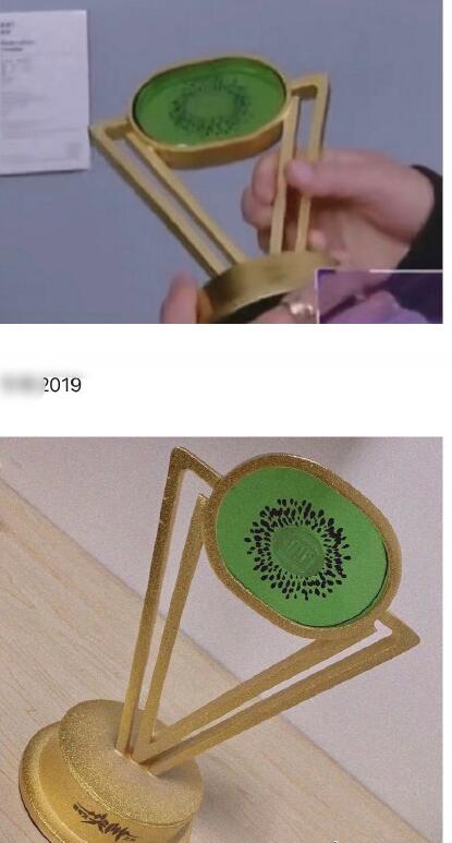 尖叫爱奇艺之夜至今已举办过6届,每年的奖杯主体都是像一块绿玻璃制成的切片猕猴桃,2019年开始的奖杯略有不同,在猕猴桃切片的基础上加了一个底座,但看上去没那么特别了。