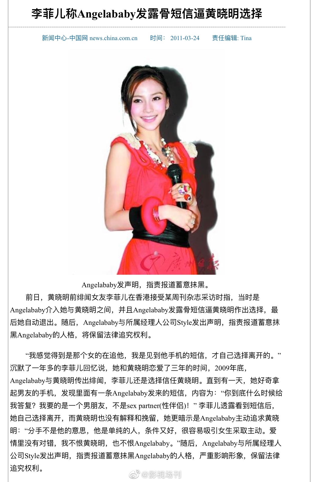 ![]() 对于baby是小三的传闻,据说最早是李菲儿接受采访的时候爆料出来的,传言黄晓明还在和李菲儿恋爱,然后baby发给黄晓明露骨短信称:“到底什么时候给我答复?我要的是一个男朋友,不是sex partner!”李菲儿说出这话的时候是在2011年3月接受香港某周刊采访的时候说的,下面则是香港某周刊给出的模拟的短信截图。当年对于这则消息,baby的经纪公司Style还发出过严正声明,称这是污蔑,严重影响形象。 ![]() 传言,李菲儿和黄晓明是在2007年认识,2010年分手的,而黄晓明和baby的被曝光恋情的时间节点是2009年。 ![]() |