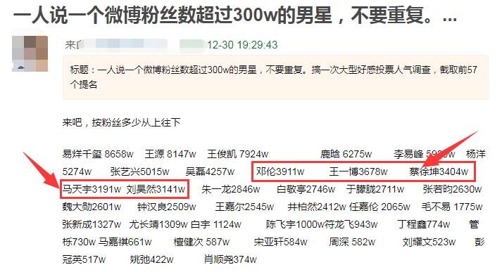按照博主的要求,不但要求微博有3000万粉丝,而且人气要顶流,再去掉已婚的,目前符合条件的男明星有:邓伦、王一博、蔡徐坤、马天宇,刘昊然、张翰、杜海涛