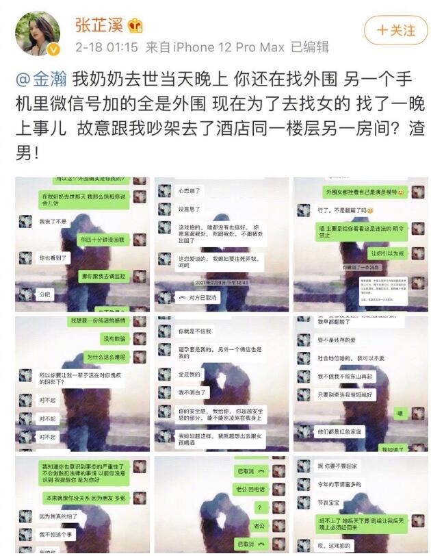 今日,演员张芷溪凌晨发文称男友金瀚出轨,在女方奶奶去世当天找外围女,甚至另一个手机号的微信里加的全是外围,暗指男友出轨成性,此事一经发出后立马点燃网络,不过很多粉丝表示不相信金瀚是那样的人,随后张芷溪删除帖子,并又发文称金瀚没有出轨,自己是因为吵架喝多了乱发的,一切都是误会。